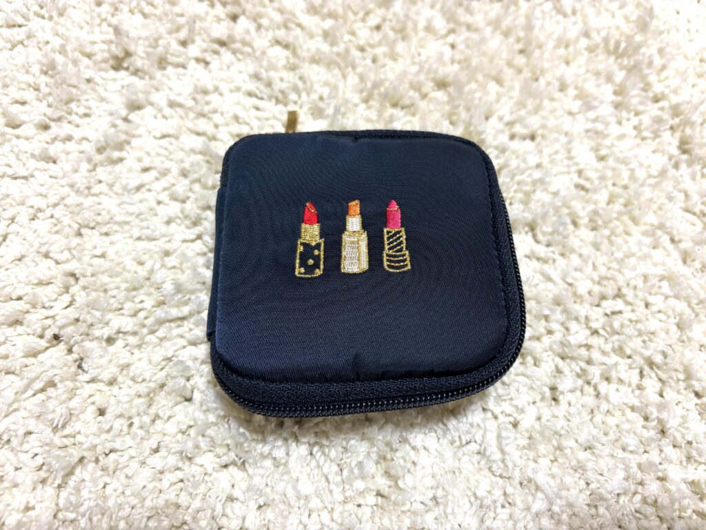 まず柄がかわいいです。光沢のある生地が使用されています。掌に乗るサイズで、厚さも2センチないくらい。