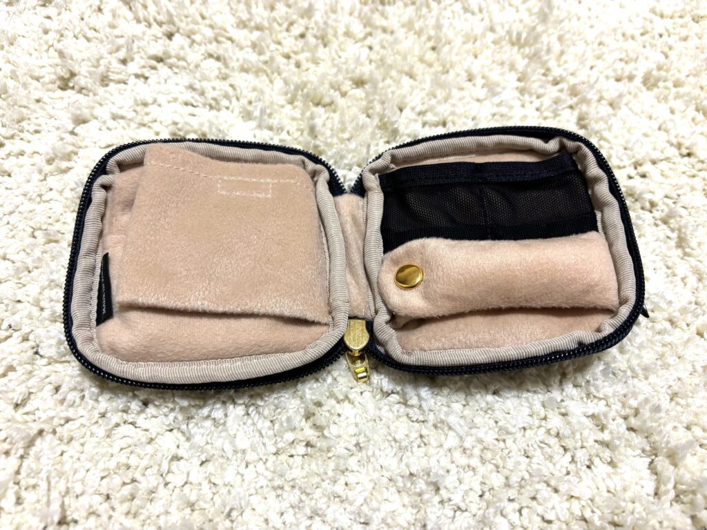 中身はこんな感じ。フリーポケット、ネックレス入れ、リングホルダーとメッシュポケットがあります。